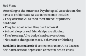 As long as chatbots are on the market, it’s probably inevitable that people are going to use them like friends and therapists. The American Psychological Association offers a guide for parents whose teens turn to chatbots. Among the key tips, it recommends asking questions instead of lecturing and watching for red flags that teens are using AI in ways that replace human interaction.